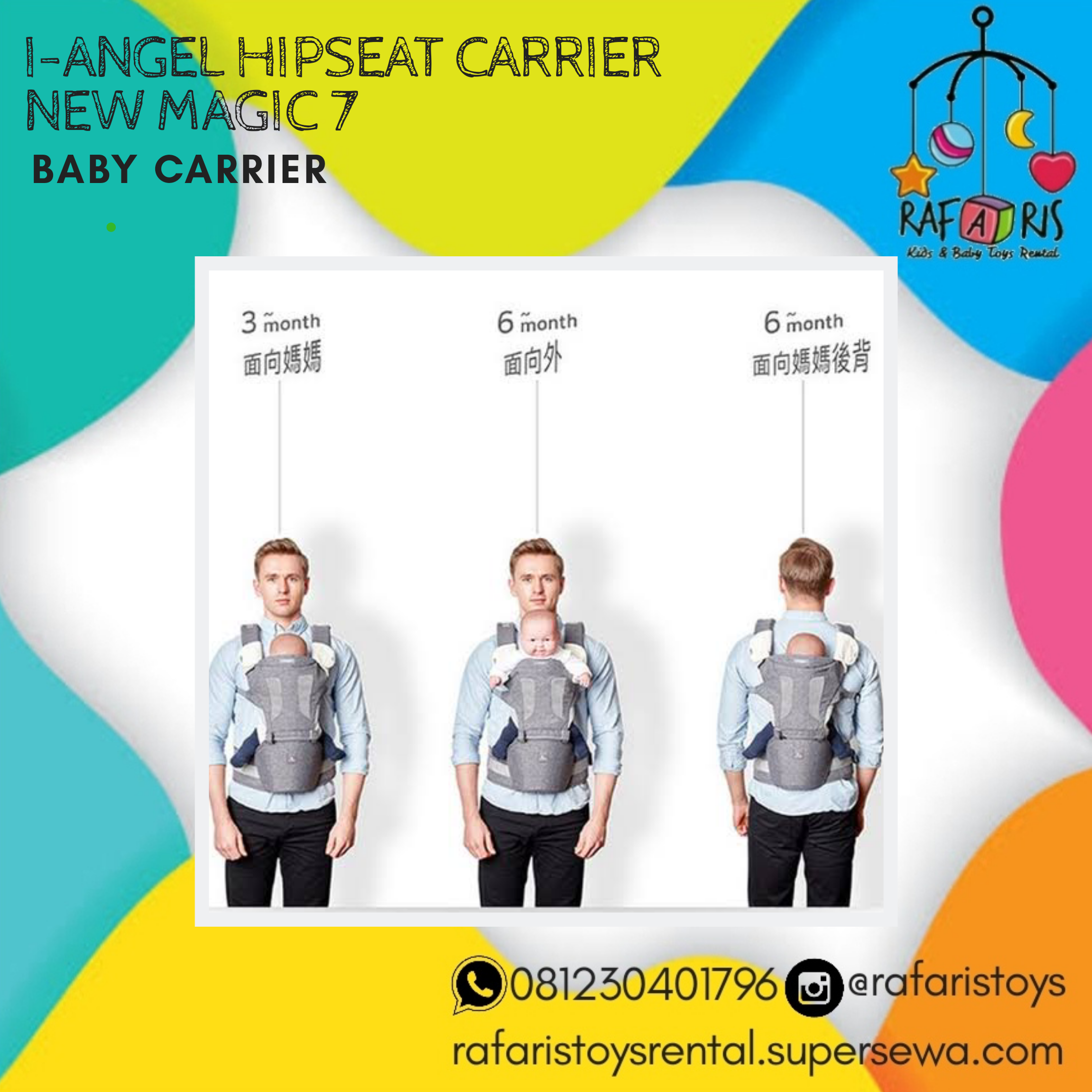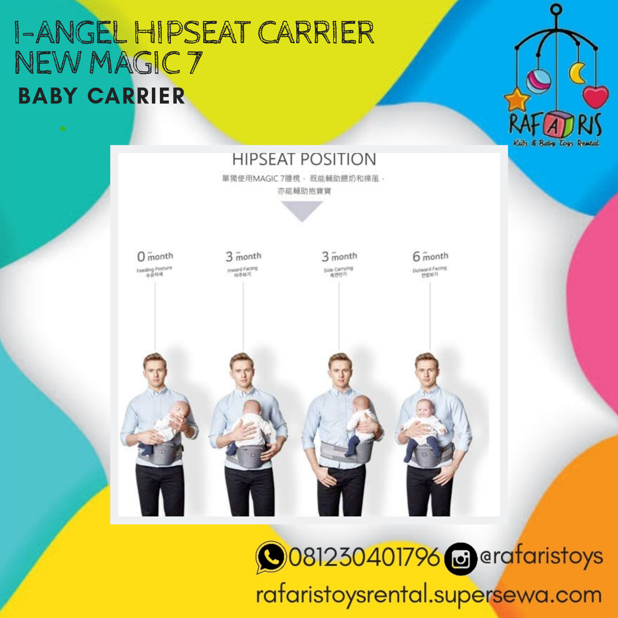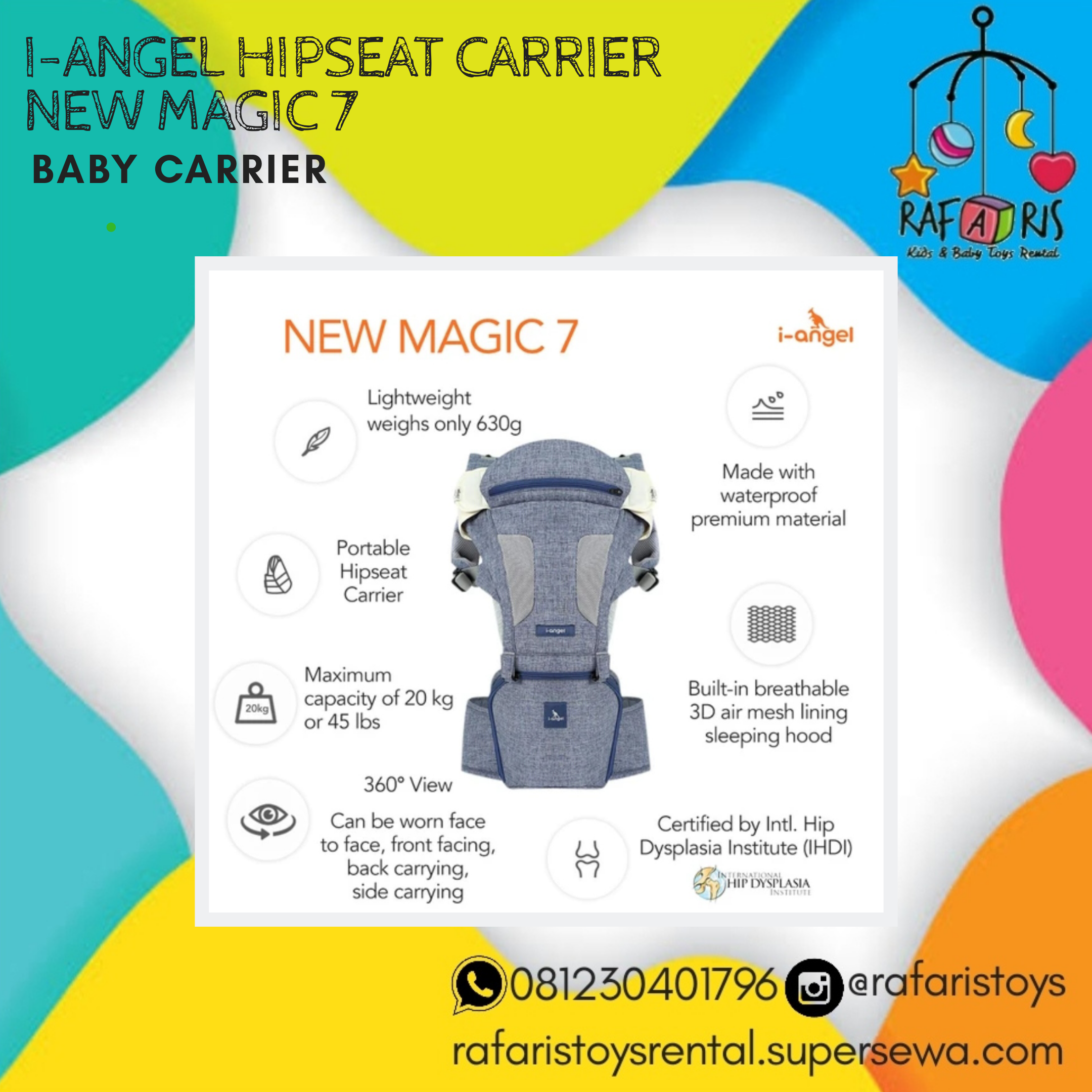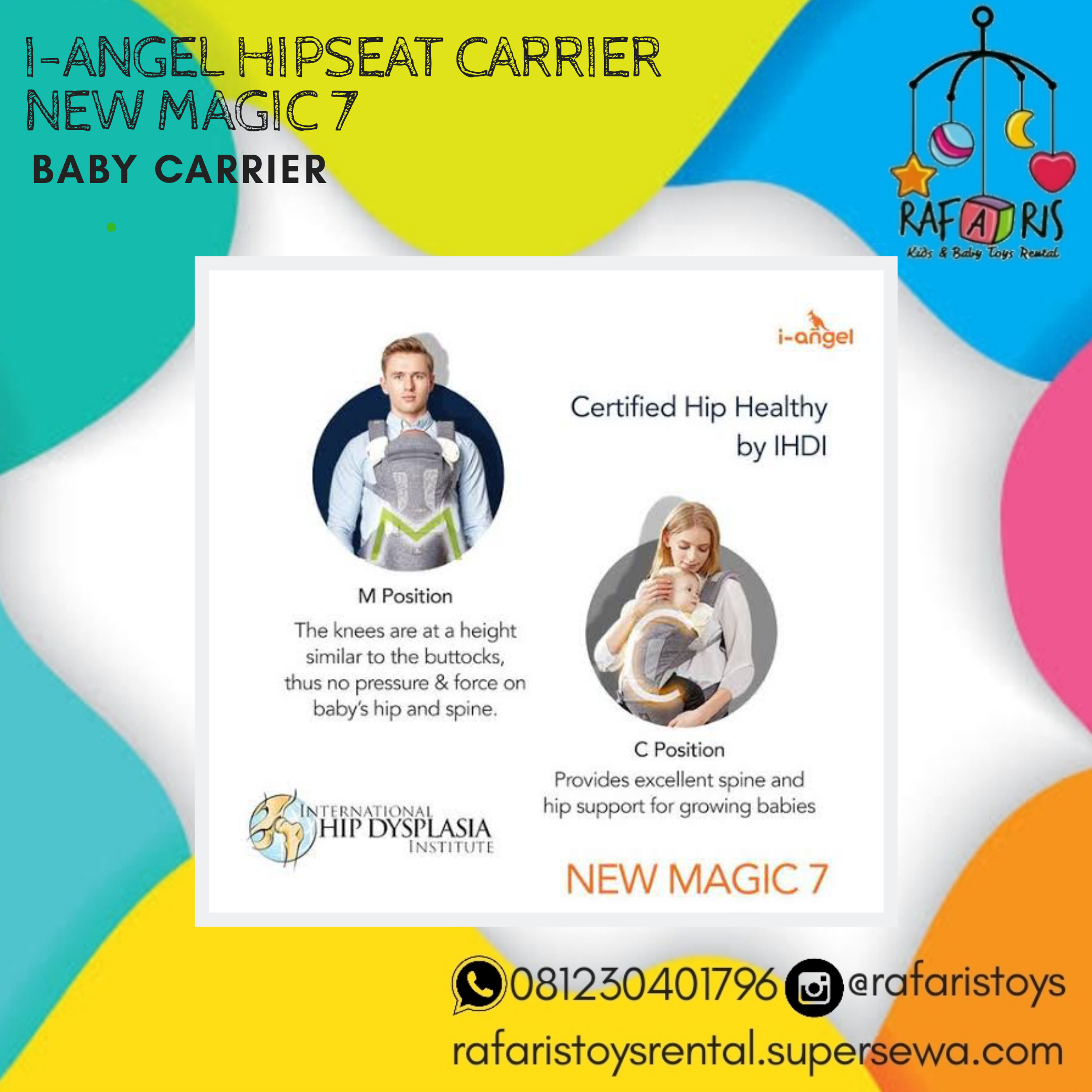 i-Angel adalah jawaban yang aman dan nyaman bagi si kecil dan orang tua. Dengan model Hip Seat pertama di dunia, dengan gendongan i-Angel si kecil dapat menghadap keluar saat digendong tanpa resiko sakit atau posisi yang salah. Orang tua pun dapat menggendong tanpa berat berlebih pada satu titik yang mengakibatkan sakit badan.