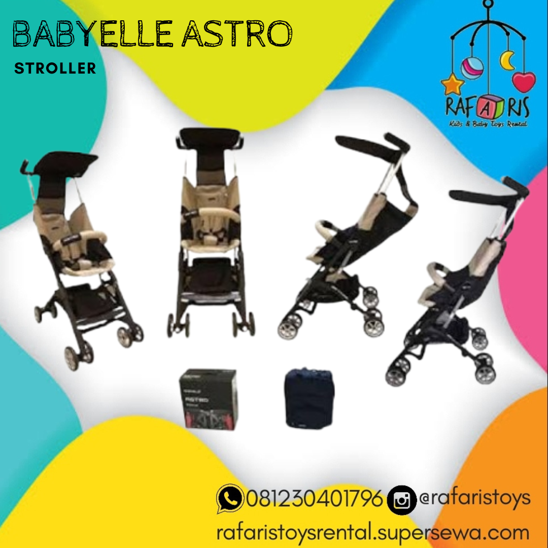 Stroller Babyelle Astro S350 recline. stroller Ini cocok digunakan untuk berpergian, olah raga atau sedang berjalan-jalan ke taman. Dibuat dari bahan berkualitas terbaik agar si kecil nyaman. Ibu pun kini tidak lagi repot menggendong si kecil yang semakin besar. Sediakan kereta dorong di rumah agar Ayah dan Ibu menjadi lebih mudah dan si kecil tetap ceria. Spesifikasi Produk Saran Usia : 6 Bulan (Sudah Bisa Duduk) Berat Maksimal : 20kg Berat Stroller : 4kg Posisi bisa tidur 150 derajat Dimensi: Posisi Terlipat: 39x 19 x 33 cm Posisi Terbuka: 98 x 55 x 104cm