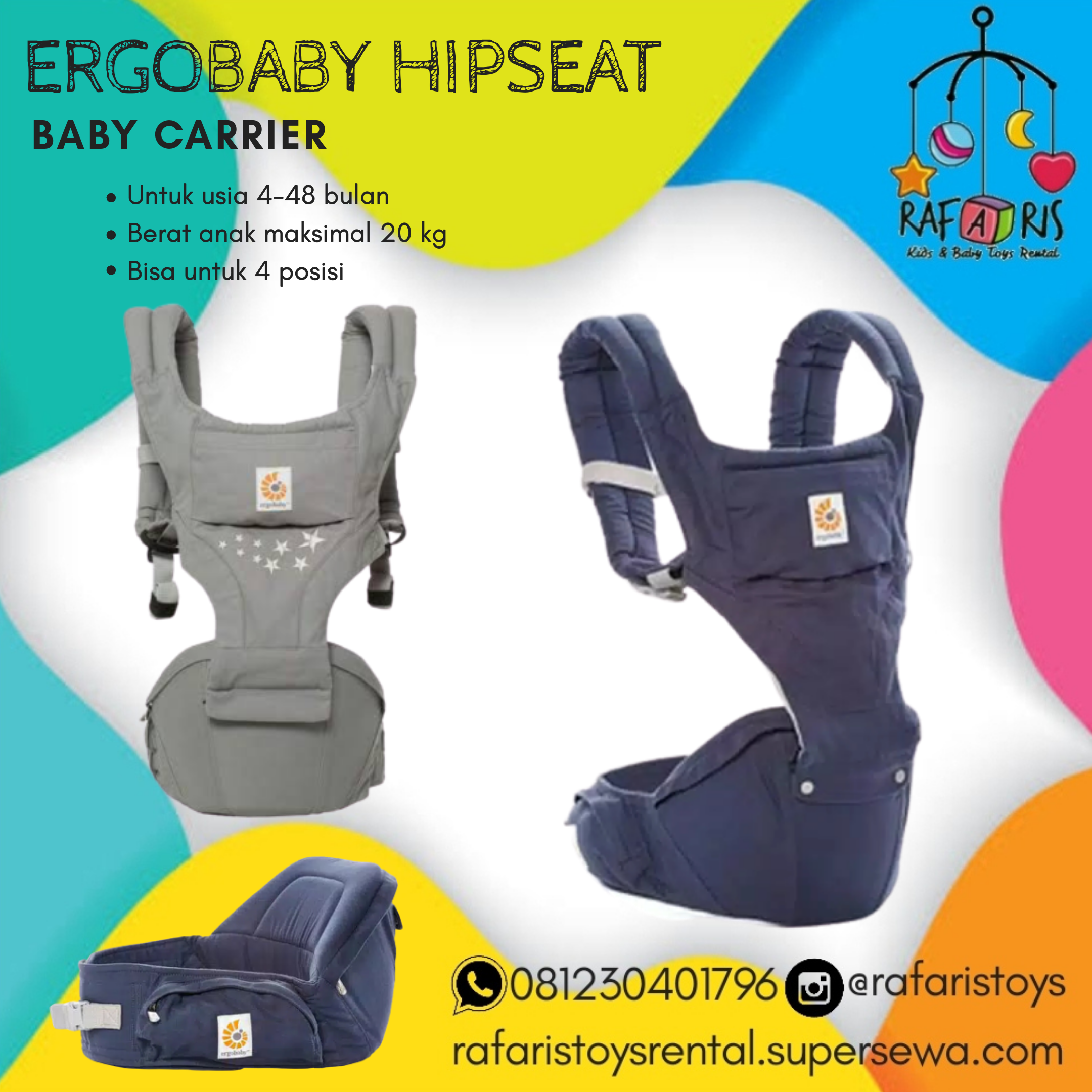 Gendongan ErgoBaby Hipseat, merupakan gendongan modern dengan model hip seat, sang buah hati bisa menghadap Ayahbunda ataupun menghadap ke depan. Gendongan ini meringankan beban Ayahbunda saat menggendong sang buah hati. Ayahbunda tetap bisa melakukan aktivitas sehari-hari sambil menggendong sang buah hati tampa rasa takut kepegalan. Posisi Gendong DENGAN atau TANPA sandaran: (1) Hadap Belakang (2) Hadap Depan/ Luar (3) Gendong Di Punggung (4) Gendong Samping/ Hip Position.