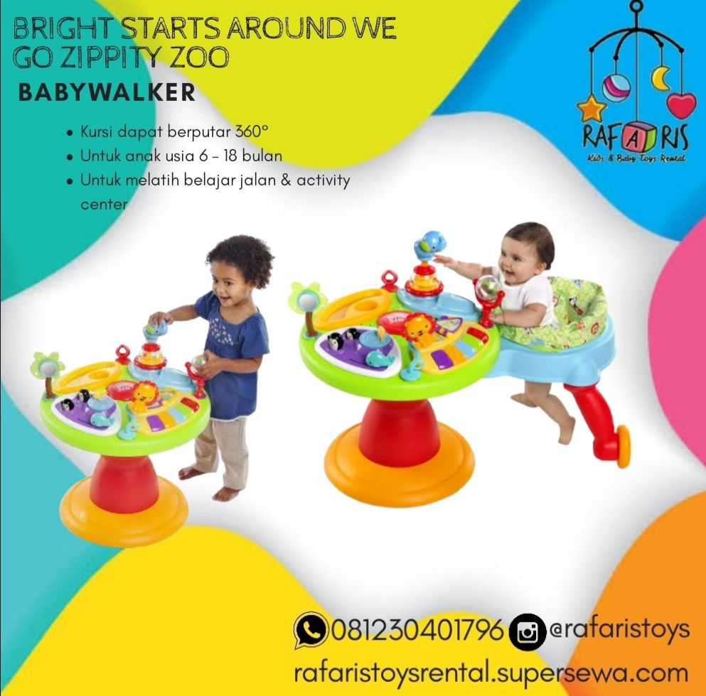 RAFARIS TOYS RENTAL menyewakan sebuah mainan yang di desain demi keamanan anak anda saat belajar berjalan. Menciptakan wilayah belajar berjalan yang aman bagi anak anda. Kursi dapat berputar mengelilingi meja 360 derajat. Anak anda akan betah berlatih berjalan mengelilingi meja sekaligus mengekplorasi mainan di meja. Kursi dan meja dapat dengan mudah dicopot sehingga meja dapat tetap dipergunakan terpisah.