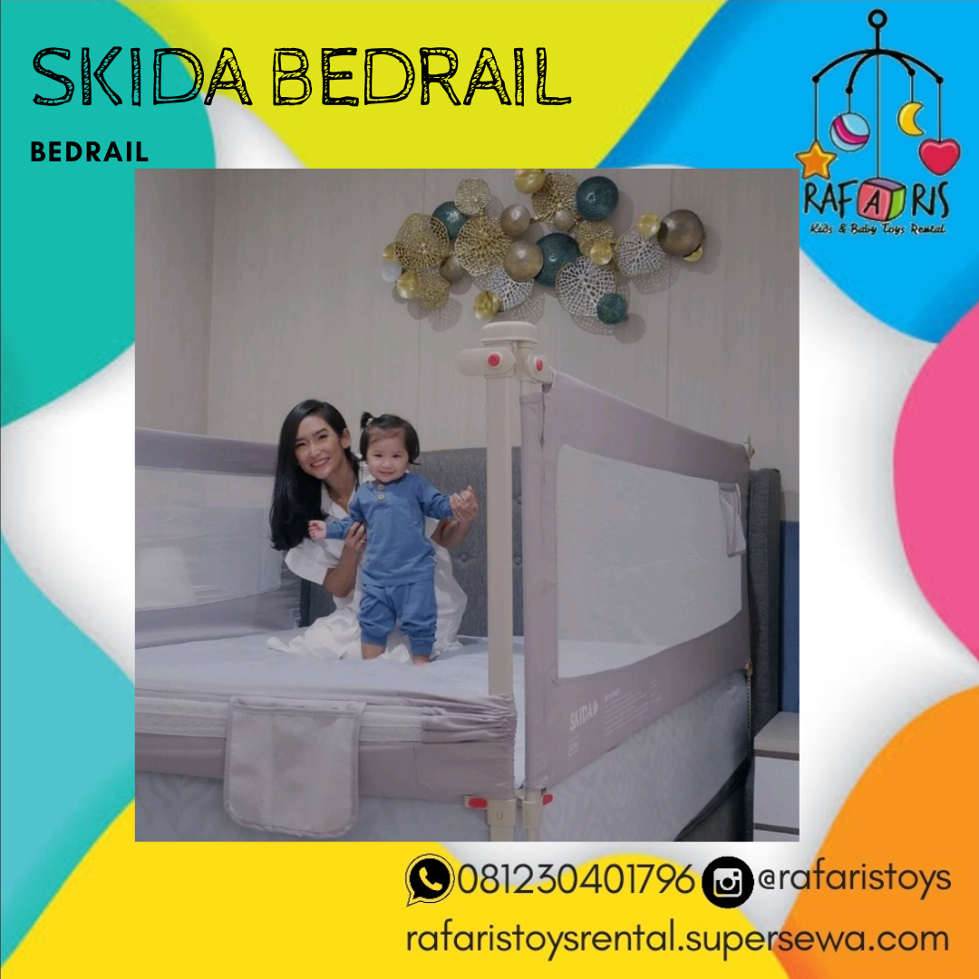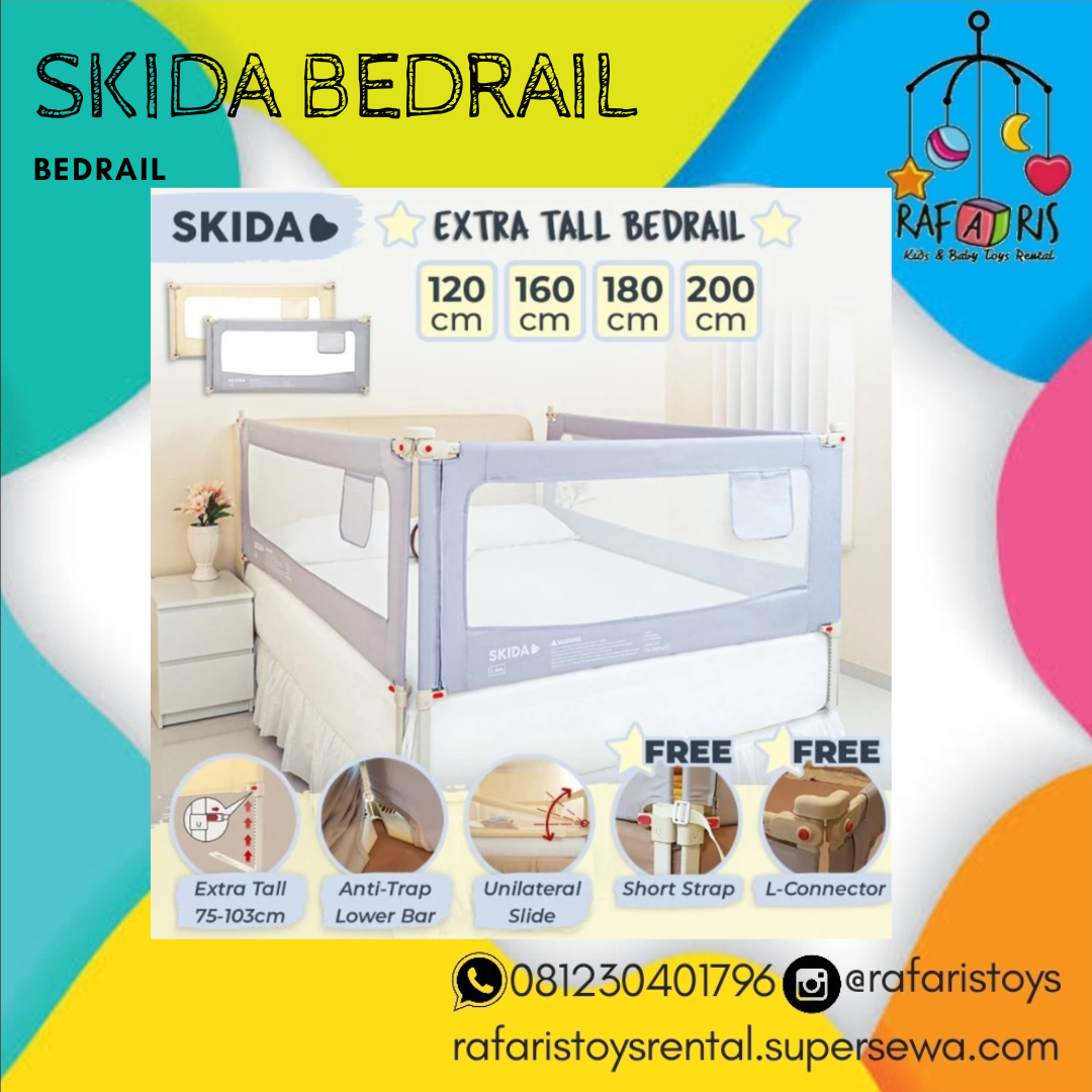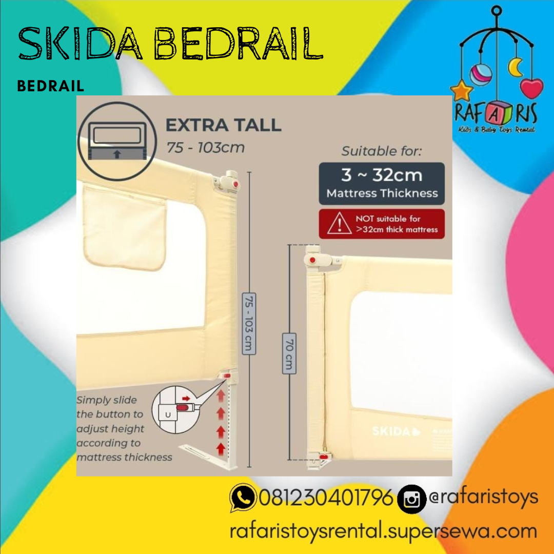 SKIDA❤️ Extra Tall Slide Down Bedrail merupakan pagar pengaman yang dipasang pada tempat tidur untuk menjaga agar anak tidak terjatuh dari tempat tidur. Tinggi bedrail dapat diatur dengan mudah dari 75cm sampai 103cm (extra tall), sesuai dengan ketebalan matras (tebal matras maximum 32cm). Bedrail Skida dilengkapi dengan 'flat bottom bar' yang mengarah ke sisi kasur untuk menghindari bayi dari terjebak di antara kasur dan bedrail (prevents entrapment).