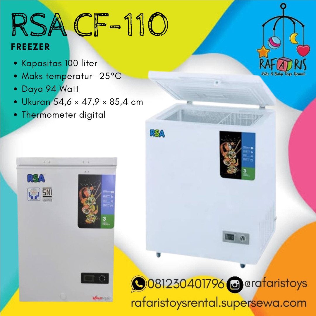 Lemari Pembeku RSA chest freezer dapat diaplikasikan untuk menyimpan aneka makanan beku (frozen food), ice cream, daging beku, seafood, nugget, dll akan menjaga gesegaran makanan lebih lama. Dengan tambahan fitur thermometer digital, cepat beku dan hemat energi.