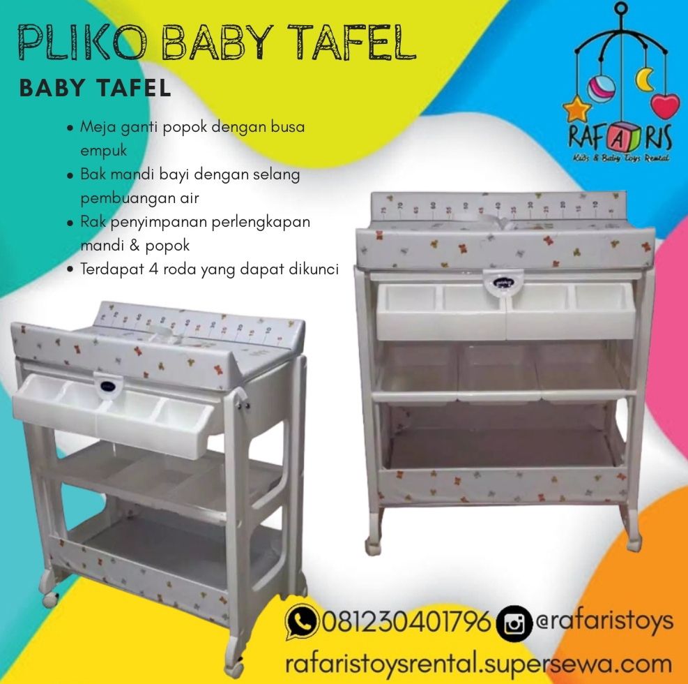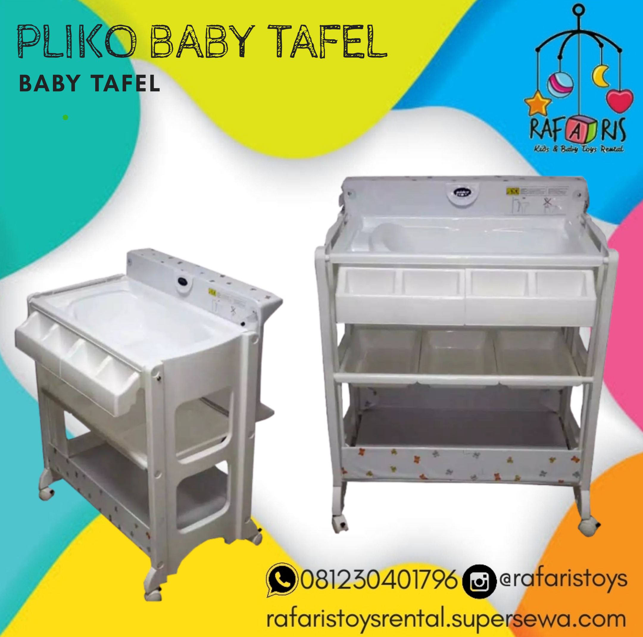 Pliko baby tafel merupakan salah satu furniture bayi yang wajib dimiliki para orangtua. Fitur yang lengkap seperti meja ganti popok bermatras busa empuk, dibawahnya ada bathub untuk memandikan bayi dilengkapi selang pembuangan air, console untuk menempatkan perlengkapan mandi bayi, rak untuk baju & perlengkapan lainnya, tersedia juga jaring gantung disamping baby tafel sebagai tempat sementara menaruh popok / pakaian kotor bayi. Empat roda untuk memudahkan memindahkan dari satu ruang ke ruangan lainnya, dilengkapi kunci (rem) pada keempat roda.